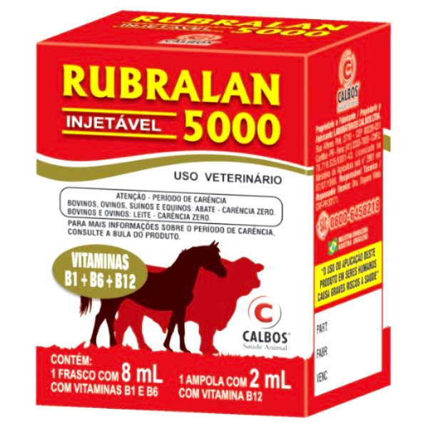 RUBRALAN 5000, Único no mercado composto com Vitaminas do Complexo B, é usado no preparo de animais que exigem grandes esforços físicos. Indicado para uma rápida recuperação de animais debilitados, além de auxiliar no tratamento de de problemas sanguíneos e neuromusculares.